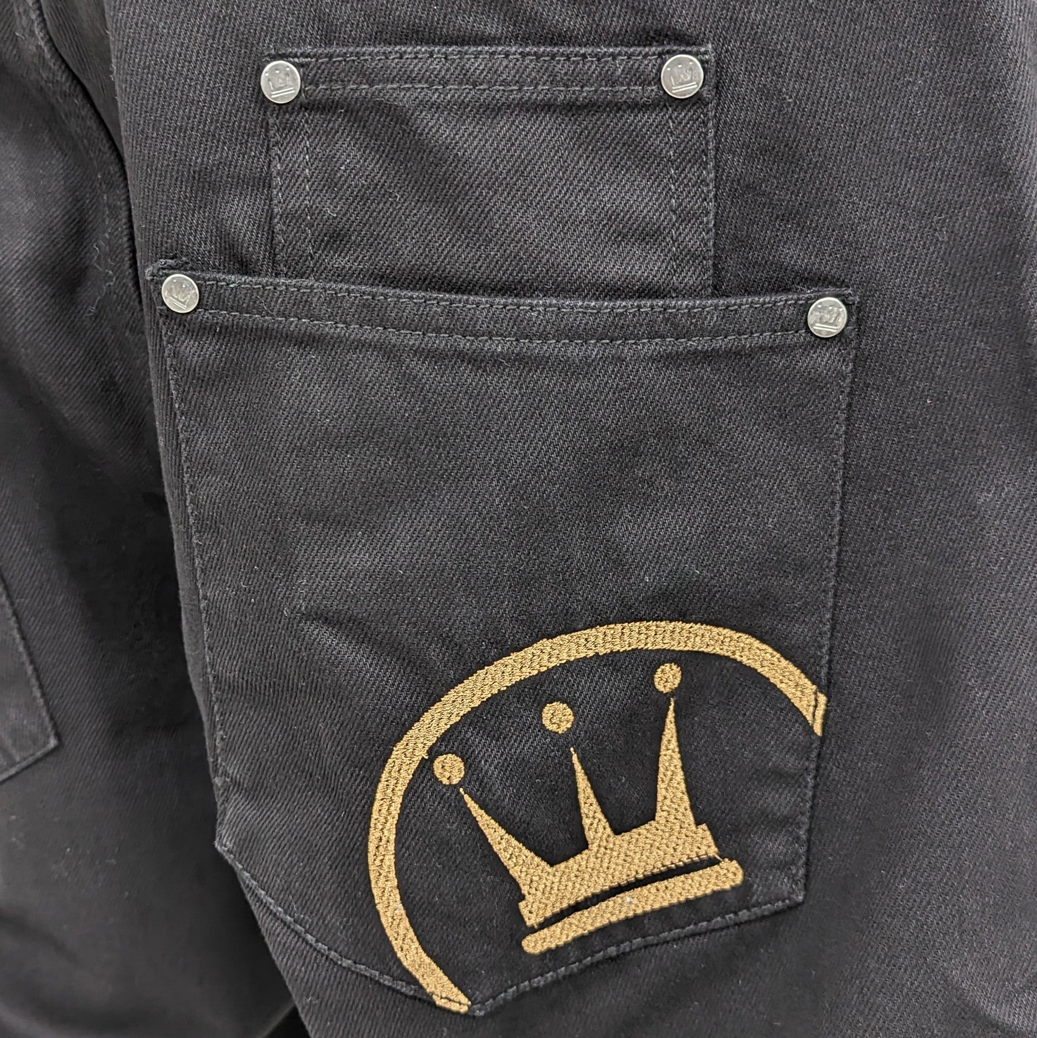 - aufwendige goldene Logo-Stitch Details